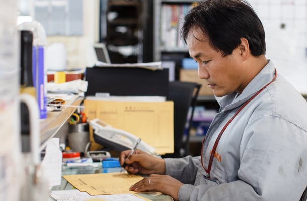 製造工程を細かく分解(各 2 ~ 3 名にわかれて作業します)。